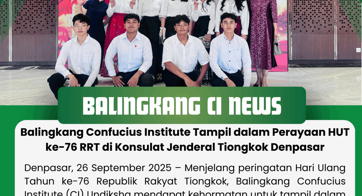 Denpasar, 26 September 2025 – Menjelang peringatan Hari Ulang Tahun ke-76 Republik Rakyat Tiongkok, Balingkang Confucius Institute (CI) Undiksha mendapat kehormatan untuk tampil dalam acara perayaan yang diselenggarakan oleh Konsulat Jenderal Tiongkok di Denpasar. Dalam kesempatan ini, Balingkang CI menjadi satu-satunya penampil yang mengisi sesi pertunjukan budaya.