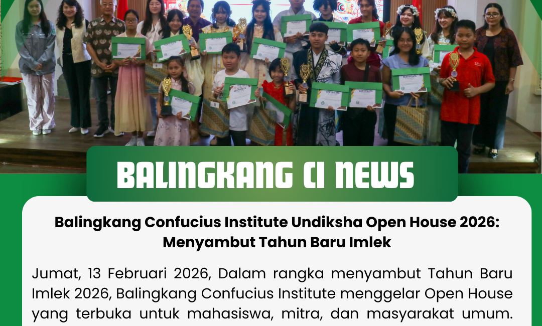 Dalam rangka merayakan Tahun Baru Imlek 2026, Balingkang Confucius Institute menyelenggarakan kegiatan Open House sebagai bentuk apresiasi terhadap kekayaan budaya Tiongkok sekaligus mempererat kebersamaan lintas budaya di lingkungan Undiksha dan masyarakat luas.