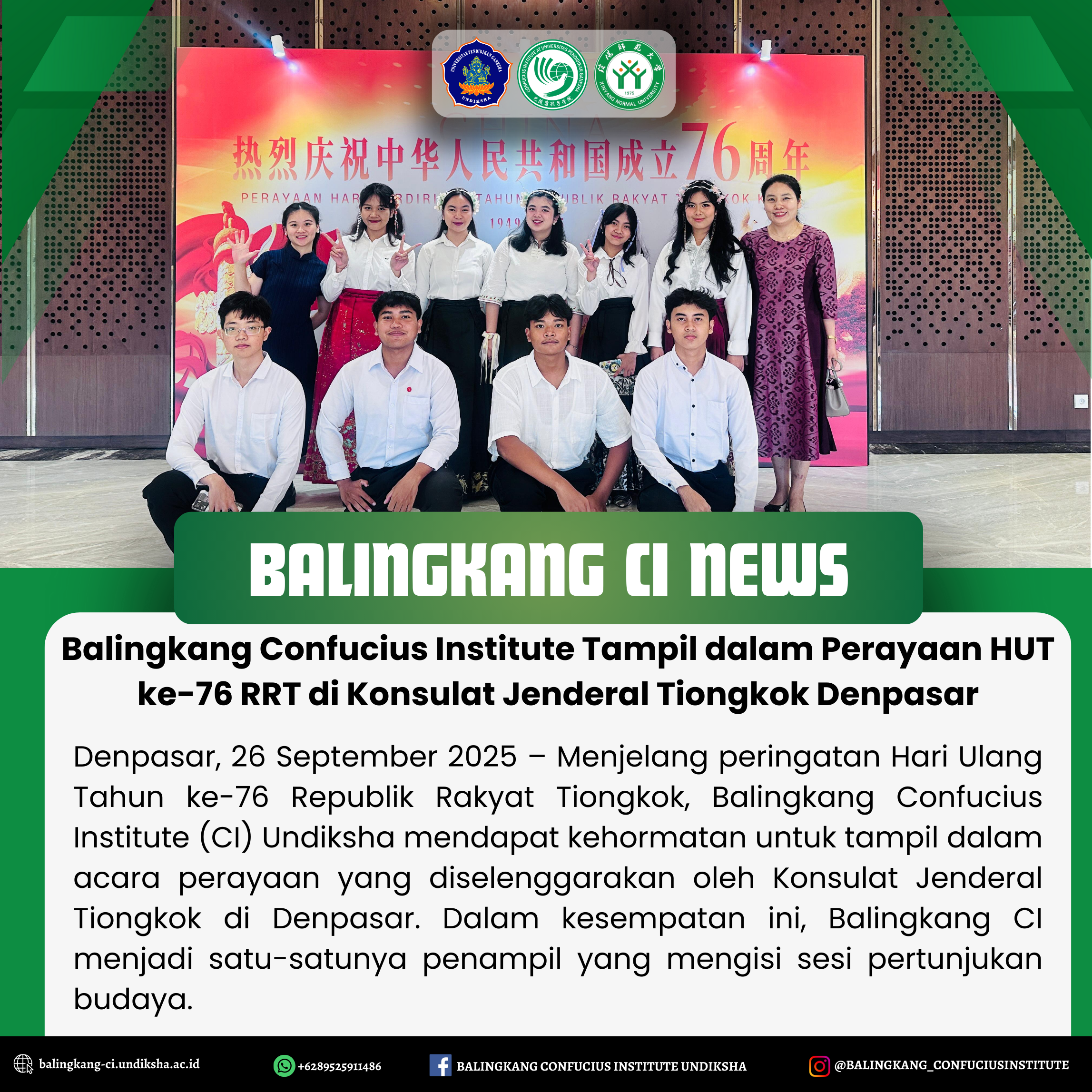 Balingkang Confucius Institute Tampil dalam Perayaan HUT ke-76 RRT di Konsulat Jenderal Tiongkok Denpasar