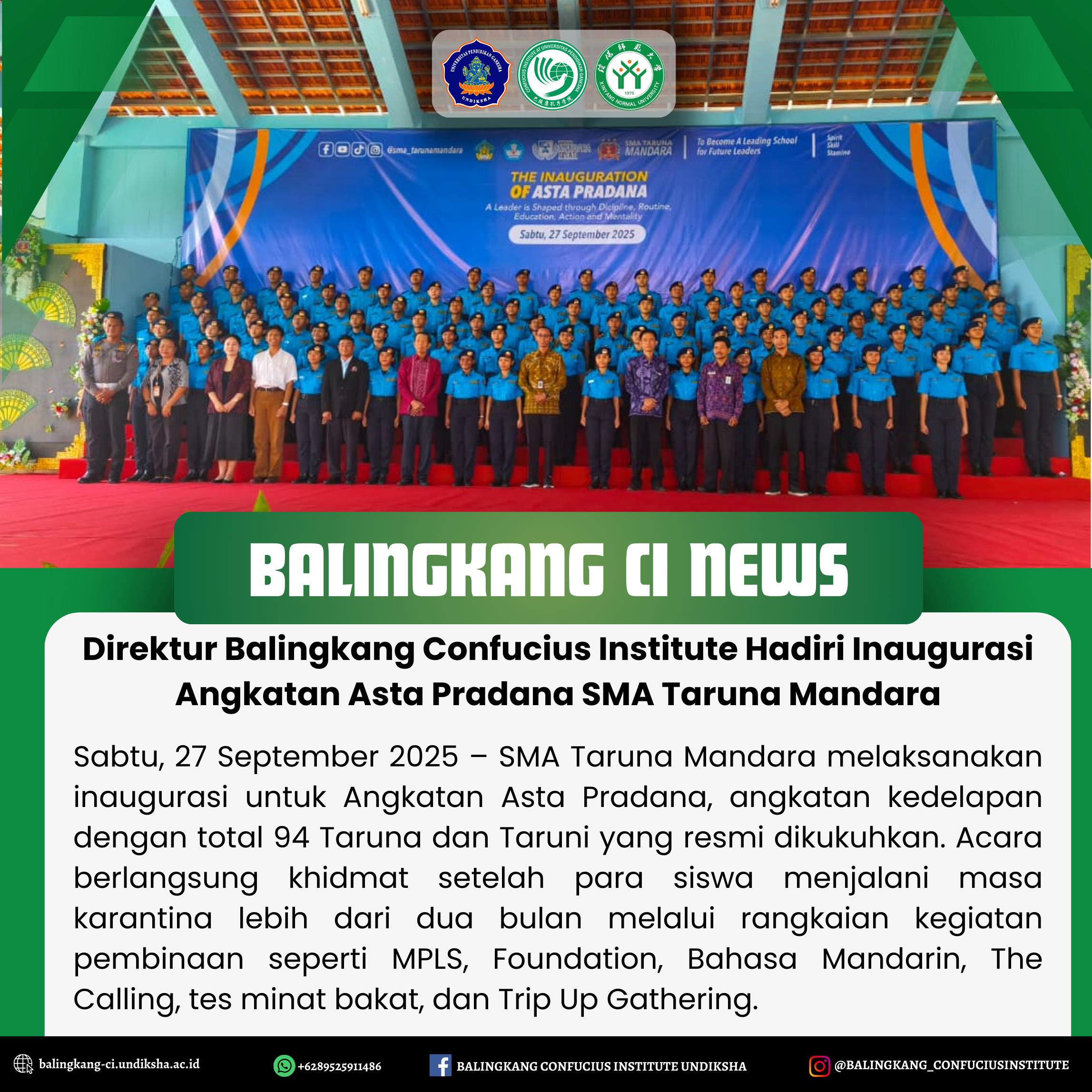 Direktur Balingkang Confucius Institute Hadiri Inaugurasi Angkatan Asta Pradana SMA Taruna Mandara